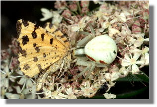 Seine Schönheit schützte ihn vor seinem Schicksal nicht: Ein getigerter Fleckenspanner (Pseudopanthera macularia) wurde Opfer des unsichtbaren Lauerjägers, der gut getarnt vor seinem Blütenhintergrund sitzt. Die Strategie ist immer dieselbe: die veränderliche Krabbenspinne überwältigt ihre Beute völlig überraschend während des Landens. |