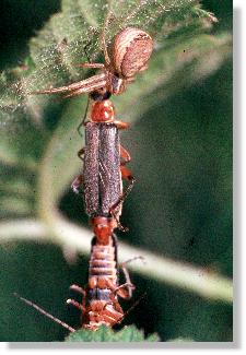 Hier hat sie gleich doppelte Beute gemacht: sie hat ein Paar des Rotgelben Weichkäfers (Rhagonycha fulva) bei der Paarung erwischt - das unromantische Ende einer romantischen Situation. Das Paar ist noch vereint und somit sind beide Tiere leichte Beute - falls die Spinne soviel Appetit aufbringt. Das Männchen ist von der Spinne im Genick gepackt worden, während das Weibchen noch eine Überlebenschance hätte, wenn sie sich von dem Männchen lösen würde. Doch möglicherweise liegt dieses Unglück jenseits des Vorstellungsvermögens dieses Käfers... |