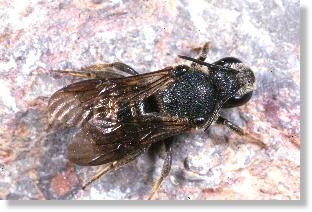 Neben Jägern, die den Bewohnern der Schilfmatte in direktem Angriff nach dem Leben trachteten, und den Parasiten, die ihr Blut saugten, sie aber am Leben ließen, gab es zahlreiche Parasitoide, die sich zunächst parasitisch die Lebenskraft der Bewohner zunutze machen, sie schließlich aber doch töten. Zu diesen Parasitoiden gehören drei Arten von Düsterbienen, die José bei den Mauerbienen fand. Sie heißen so, weil sie überwiegend schwarz eingefärbt sind - nicht unpassend wäre auch die Begründung, dass das Leben düster aussieht für die befallenen Nester. Links sehen Sie Stelis punctulatissima, |