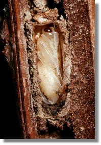 Er öffnete den Kokon und beobachtete die weitere Entwicklung. Hier ist bereits die Puppe entwickelt und beginnt mit der Einfärbung, die - wie immer - im Auge anfängt. |