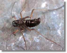 Zur Ordnung der Schnabelfliegen gehört auch die Familie der Winterhafte (Boreidae). Eine der beiden Arten, die in Mitteleuropa vorkommen, ist Boreus westwoodi. Beim Weibchen (links) sind die Flügel bis auf kaum sichtbare Schüppchen reduziert. Sie besitzt eine Legeröhre am Hinterleibsende. Man findet diese Tiere ab Herbst über den Winter hinweg bis ins Frühjahr, sie sind sehr wenig kälteempfindlich und hüpfen manchmal auch auf dem Schnee herum, was ihnen auch den Namen "Gletscherfloh" oder "Schneefloh" eingetragen hat. Ihre langen Hinterbeine erlauben diese Sprungbewegungen. Sie ernähren sich teils von toten Insekten, teils pflanzlich von Moos. |