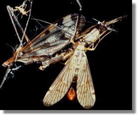 | Rechts das Männchen, das sich an einer Schnake im Spinnennetz gütlich tut. Auch die Lebensweise dieser Art ähnelt denen der vorigen. |